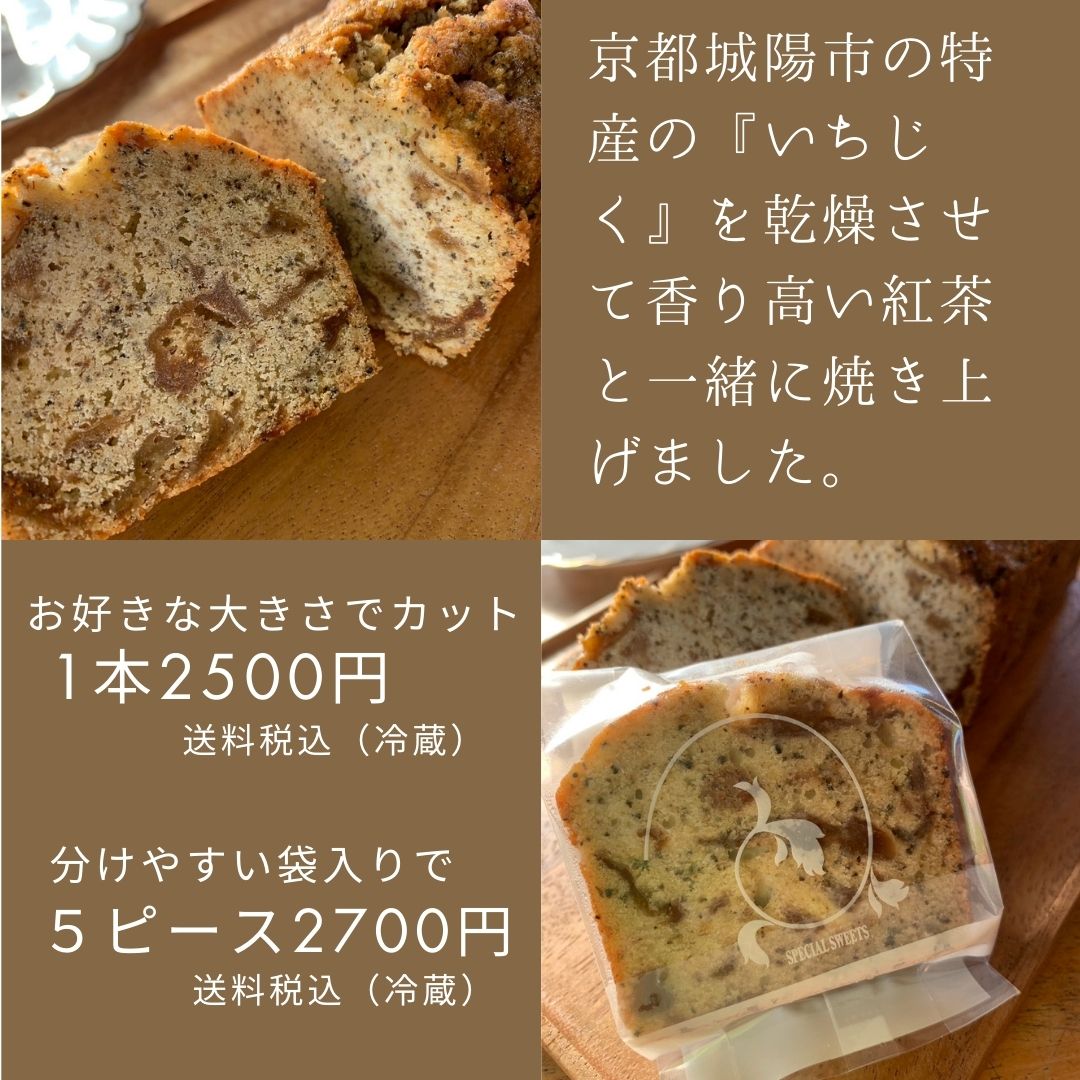 地元城陽市のいちじくを使ったパウンドケーキです。しっとりした生地に甘いイチジクの実が入った極上のパウンドケーキです。